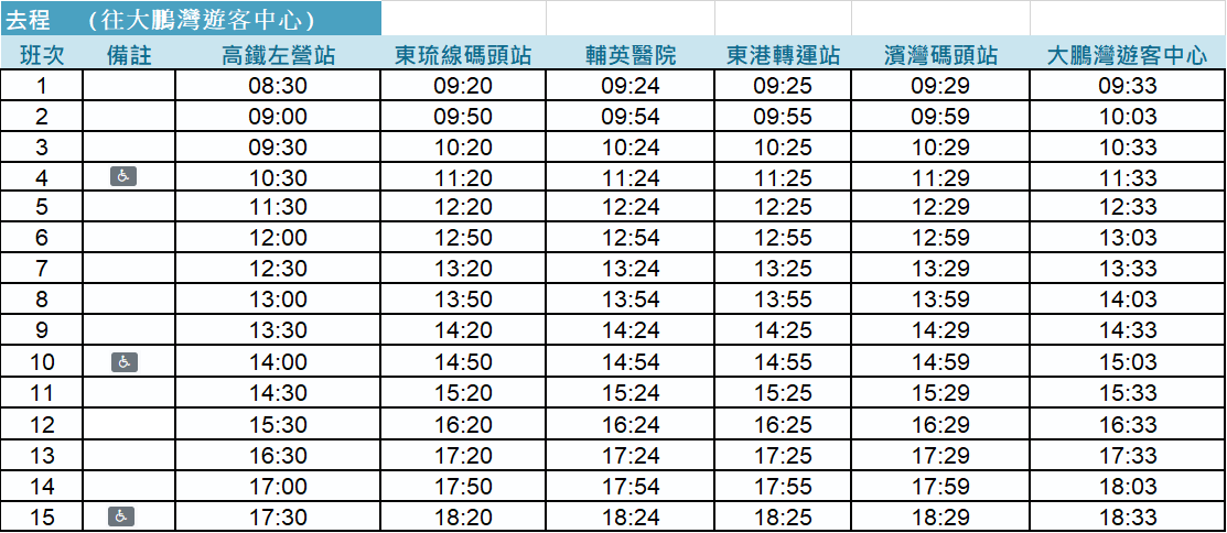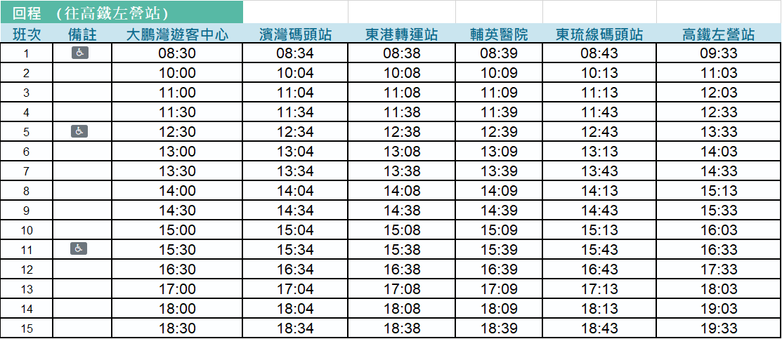 時刻表(高鐵左營站→東琉線碼頭→輔英醫(yī)院→東港轉運站→濱灣碼頭→大鵬灣遊客中心)