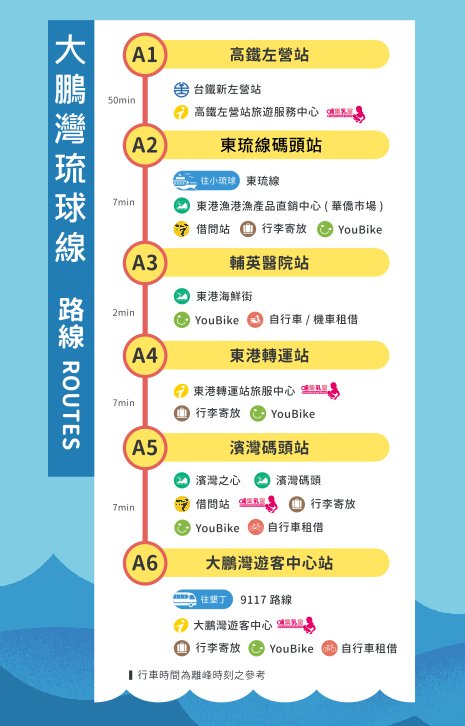 2.欲搭乘「東琉線」船班至小琉球之旅客,請於「東琉線碼頭站」下車轉乘;欲搭乘「鵬琉線」船班至小琉球之旅客,請於「濱灣碼頭站」下車轉乘。